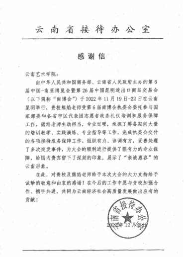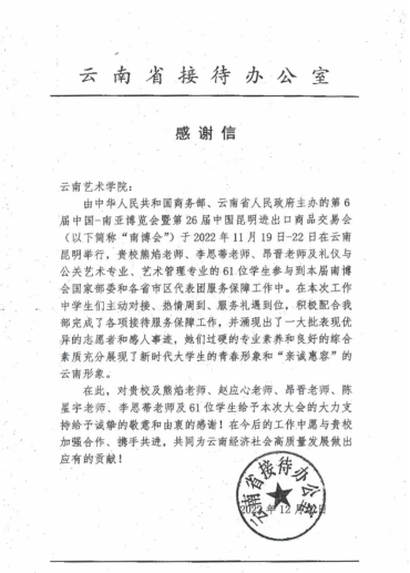 第6届中国—南亚博览会暨第26届中国昆明进出口商品交易会(以下简称“南博会”)于2022年11月19日-22日在昆明滇池国际会展中心举行。TapTap熊焰老师、赵应心老师、昂晋老师、陈星宇老师、李思蒂老师及礼仪与公关艺术专业、艺术管理专业的61位员工参与到本届南博会志愿服务工作中,为南博会圆满召开做出了积极贡献。